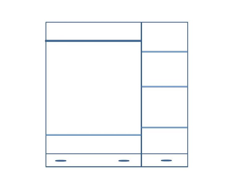 Skříň má v levé, širší části šatní tyč a vespod jednu polici, v pravé části má 5 polic. Ve spodní části skříně jsou 3 šuplíky.