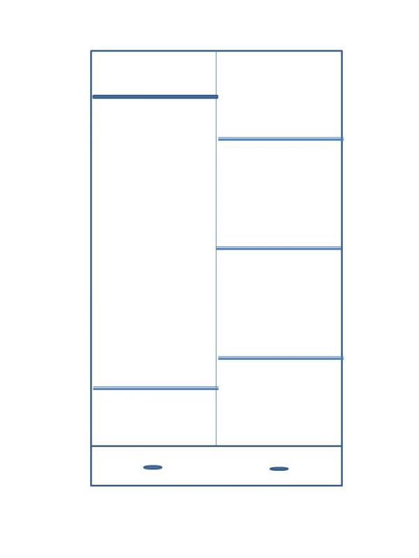 Skříň má v levé polovině 4 police, v pravé polovině má polici a pod ní šatní tyč. Ve spodní části je šuplík.
