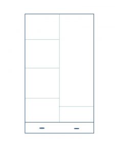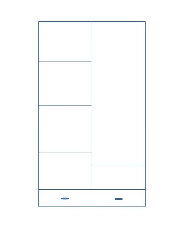 Skříň má v levé polovině 4 police, v pravé polovině má polici a pod ní šatní tyč. Ve spodní části je šuplík.