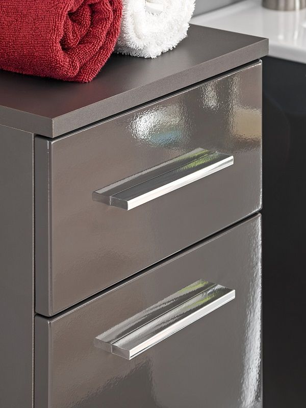 Koupelnová skříňka dolní Twist šedá je součástí koupelnové sestavy Twist, která odpovídá nejnovějším trendům, vyznačuje se svou jednoduchostí, důmyslným řešením a moderní šedou lesklou barvou. Korpusy kolekce Twist jsou z lamina matné šedé barvy, čela jsou z lamina lesklé šedé barvy. Úchytky jsou plastové. Dvířka i šuplíky jsou opatřeny systémem tichého dovírání.