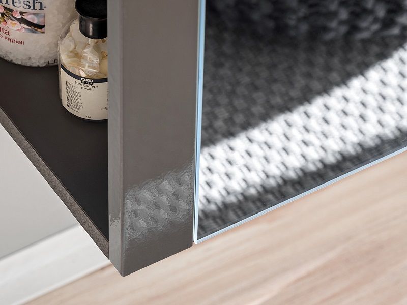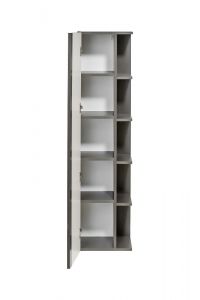 Tato vysoká skříňka má na boční straně 4 malé police, za zrcadlovými dvířky se nacházejí také 4 police.