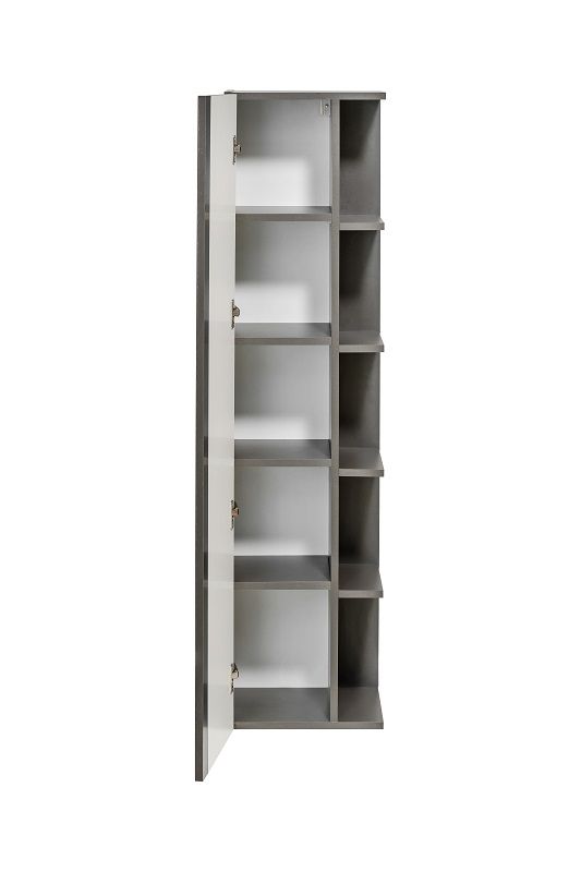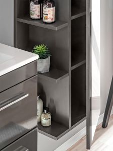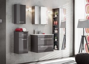 Koupelnová skříňka vysoká Twist šedá je součástí koupelnové sestavy Twist, která odpovídá nejnovějším trendům, vyznačuje se svou jednoduchostí, důmyslným řešením a moderní šedou lesklou barvou. Korpusy kolekce Twist jsou z lamina matné šedé barvy, čela jsou z lamina lesklé šedé barvy. Úchytky jsou plastové. Dvířka i šuplíky jsou opatřeny systémem tichého dovírání.