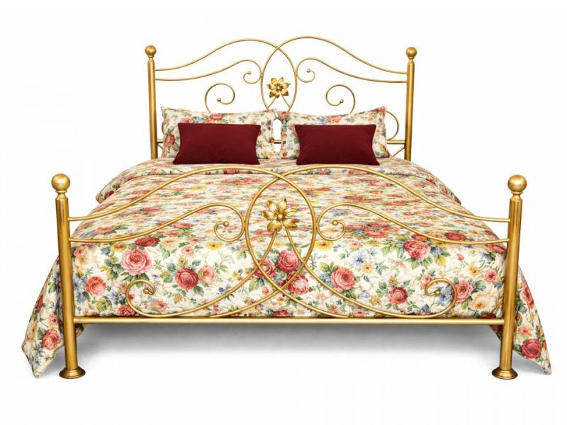 Kovová postel Alexandra - patina zlatá (viz. doplňující obrázek) je vyrobená z kvalitní oceli o průměru 25 mm a ozdobné tyče s průměrem fi 16 a fi 12. Výška postele od země k roštu je 25 cm. Výška čela u hlavy je 112 cm, výška čela u nohou je 82 cm. Nohy jsou vyrobeny z kulatého profilu o průměru 42 mm.