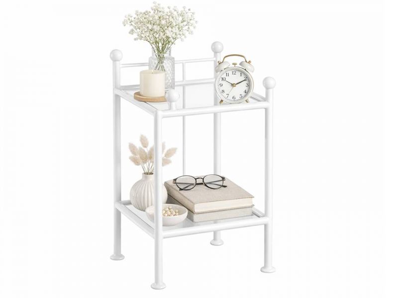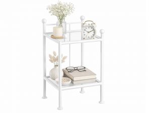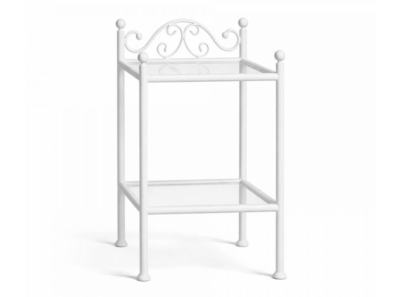 Kovový noční stolek univerzální - barva bílá (viz. doplňující obrázek) je ruční mistrovská práce. Lze ho kombinovat s mnoha kovovými postelemi, které máme v naší nabídce. Je vyrobený z kvalitní oceli o průměru 22 mm a ručně kovaných prutů o průměru 10 mm. Noční stolek má dvě skleněné poličky o rozměru 34,5 x 34,5 cm a tloušťce skla 4 mm. Kovový noční stolek je pokrytý bílou strukturální barvou, která je nanášená při vysoké teplotě ve stříkací kabině. Jedná se o moderní práškové nanášení barvy. Barva je odolná proti oděru a poškrábání. Barva má charakteristickou strukturu připomínající slupku pomeranče.