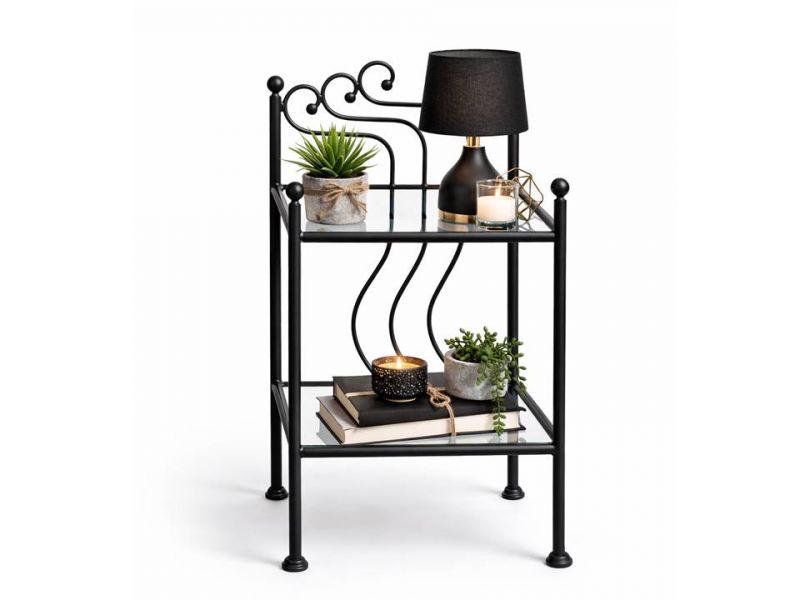 Kovový noční stolek Oáza - Roxana - patina měděná (viz. doplňující obrázek) je ruční mistrovská práce. Doporučujeme ho kombinovat s kovovými postelemi Oáza a Roxana, které máme v naší nabídce. Je vyrobený z kvalitní oceli o průměru 22 mm a ručně kovaných prutů o průměru 10 mm. Noční stolek má dvě skleněné poličky o rozměru 34,5 x 34,5 cm a tloušťce skla 4 mm. Kovový noční stolek je ve finální fázi natřen základní černou strukturální barvou a je ručně přidáváná měděná patina.