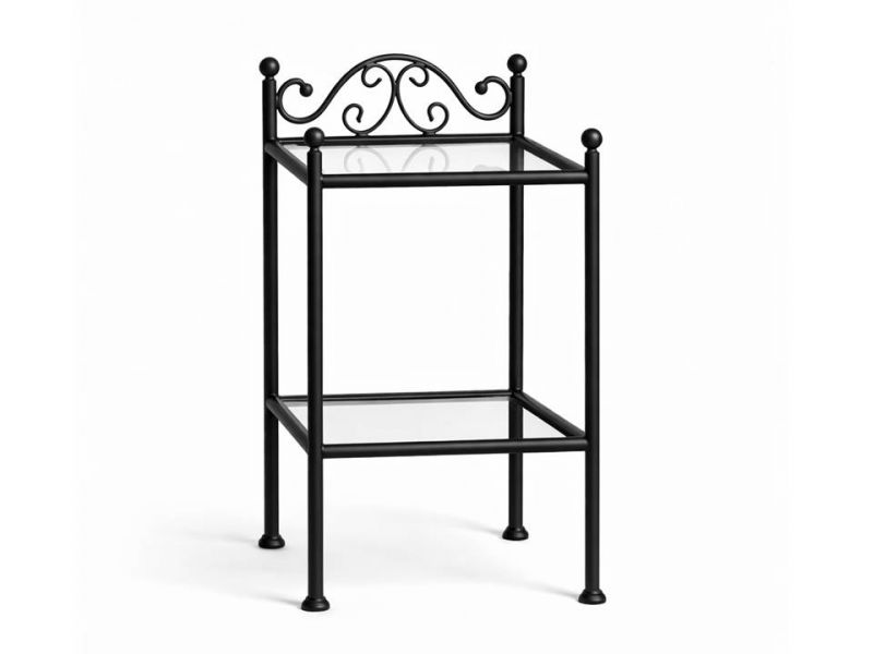 Kovový noční stolek univerzální - patina měděná (viz. doplňující obrázek) je ruční mistrovská práce. Lze ho kombinovat s mnoha kovovými postelemi, které máme v naší nabídce. Je vyrobený z kvalitní oceli o průměru 22 mm a ručně kovaných prutů o průměru 10 mm. Noční stolek má dvě skleněné poličky o rozměru 44,5 x 44,5 cm a tloušťce skla 4 mm. Kovový noční stolek je ve finální fázi natřen základní černou strukturální barvou a je ručně přidáváná měděná patina.