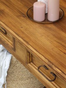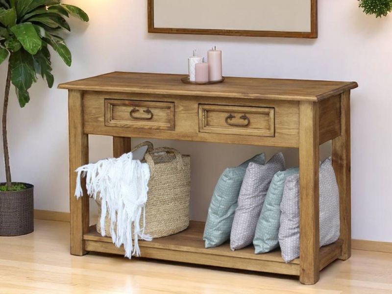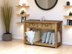 Odkládací stůl Mexicana je zhotoven v rustikálním stylu, který je velice útulný a nadčasový. Stůl je vyroben z borovicového masivu, povrch je mořený a poté lakovaný ekologickým polomatným lakem. Pod nátěrem se rýsuje struktura dřeva.