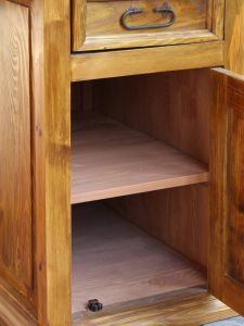Stůl má celkem 5 šuplíků, které nejsou opatřeny kovovými pojezdy, posouvají se pouze po dřevěných lištách, taktéž výsuvná deska pod pracovní deskou. Za dvířky se nachází jedna police.