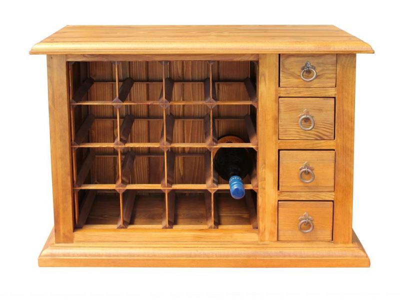 Skříňka na víno Mexicana je zhotovena v rustikálním stylu, který je velice útulný a nadčasový. Skříňka je vyrobena z borovicového masivu, povrch je ošetřen přírodním včelím voskem, pod kterým se rýsuje struktura dřeva.