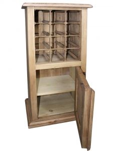 Skříňka má 12 přihrádek na lahve a pod nimi dvířka. Záda skříňky jsou z dřevěných lištiček zapuštěných do sebe.