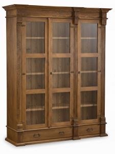 Vitrína má za prosklenými dvířky 3 police. Ve spodní části se nacházejí šuplíky, které nejsou na kovových pojezdech, posouvají se po dřevěných lištách.